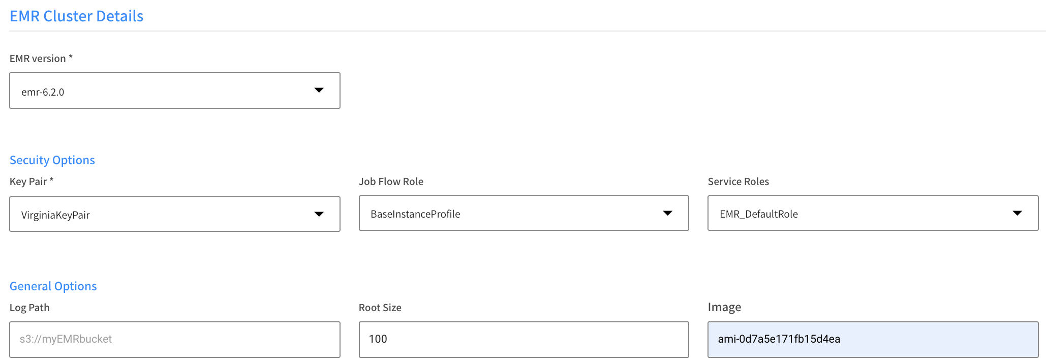 • Image: Enter the ID for a custom AWS EBS-backed linux AMI in case the cluster uses custom AMI.