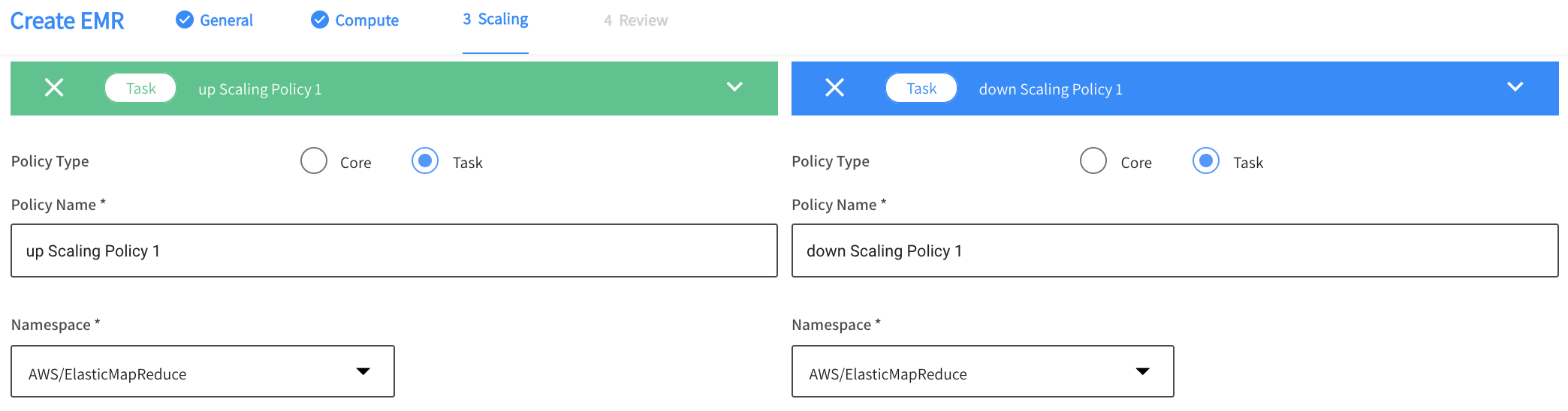 In the Scaling tab, you can add Up Scaling and Down Scaling policies. For each policy, complete the General and Based-on information described below. You can create multiple policies.