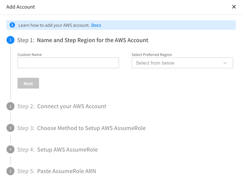 14. Paste the value of the AssumeRoleArn copied from the output of the stack and click Add Account.
