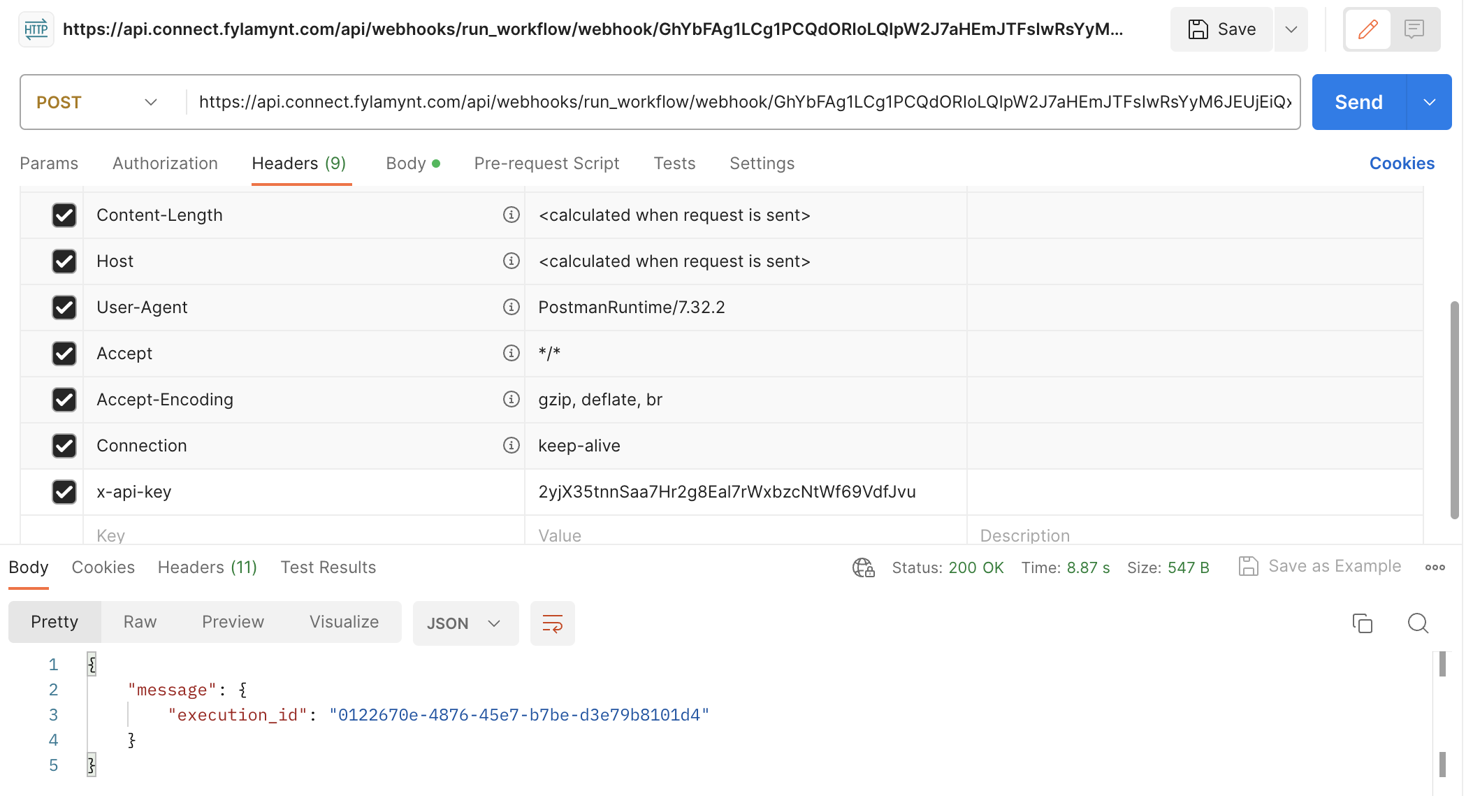 To trigger the execution of the Spot Connect workflow you created, a third-party system needs to send a POST request to a specific webhook URL, with an authorized API key included in the request header x-api-key. You can use Postman to test this.